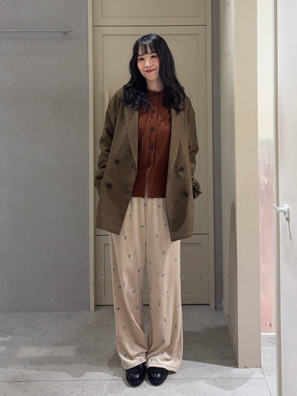 \ オール同系色! ブラウンコーデ! / 花柄が可愛くてお洒落なパンツをメインに、カーディガンとジャケットで合わせてみました^o^ パンツは着心地が良く、楽に履いていただけます◎ また、フレアのシルエットが脚を細く長く見せてくれます♩
