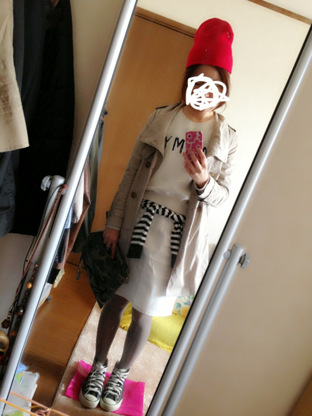 今日は白コーデにニット帽がポイント〜♡ カラーもののトレンチ欲しいなぁ〜♪