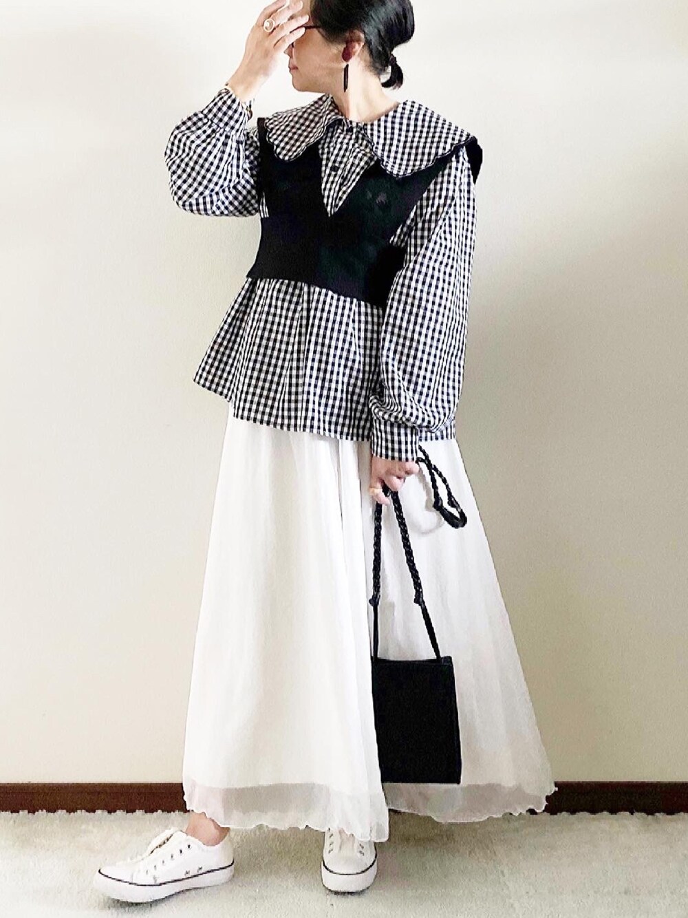 naoのシャツ/ブラウス「無地・ギンガムチェックスカラップ刺繍ビッグカラーブラウス<デザインブラウス>【ZOZO限定アイテム】」を使ったコーディネート