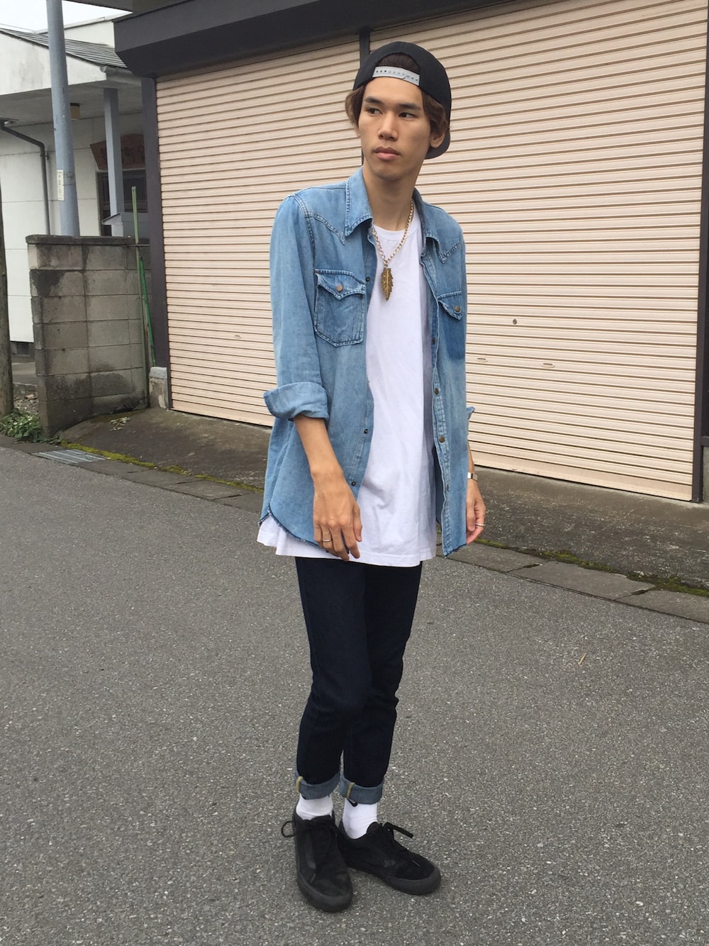 デニムオンデニム👖✨ 薄いデニムと濃いデニムを合わせました😎 キャップとゴールドネックレスとシューズでストリート感を出しました🔥