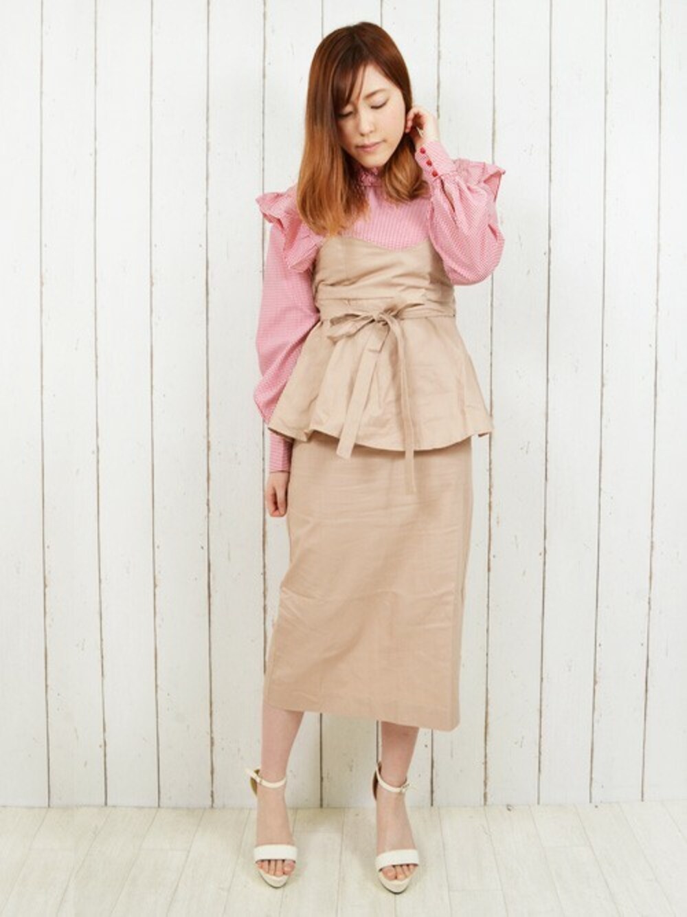 TOPS ▶ ギンガムチェックフリルブラウス \2,797 ONEPIECE ▶ 綿ツイルベアワンピース ¥3,229 SHOES▶ チャンキーヒールサンダル \2,700 ピンクベージュで大人ガーリーに✨