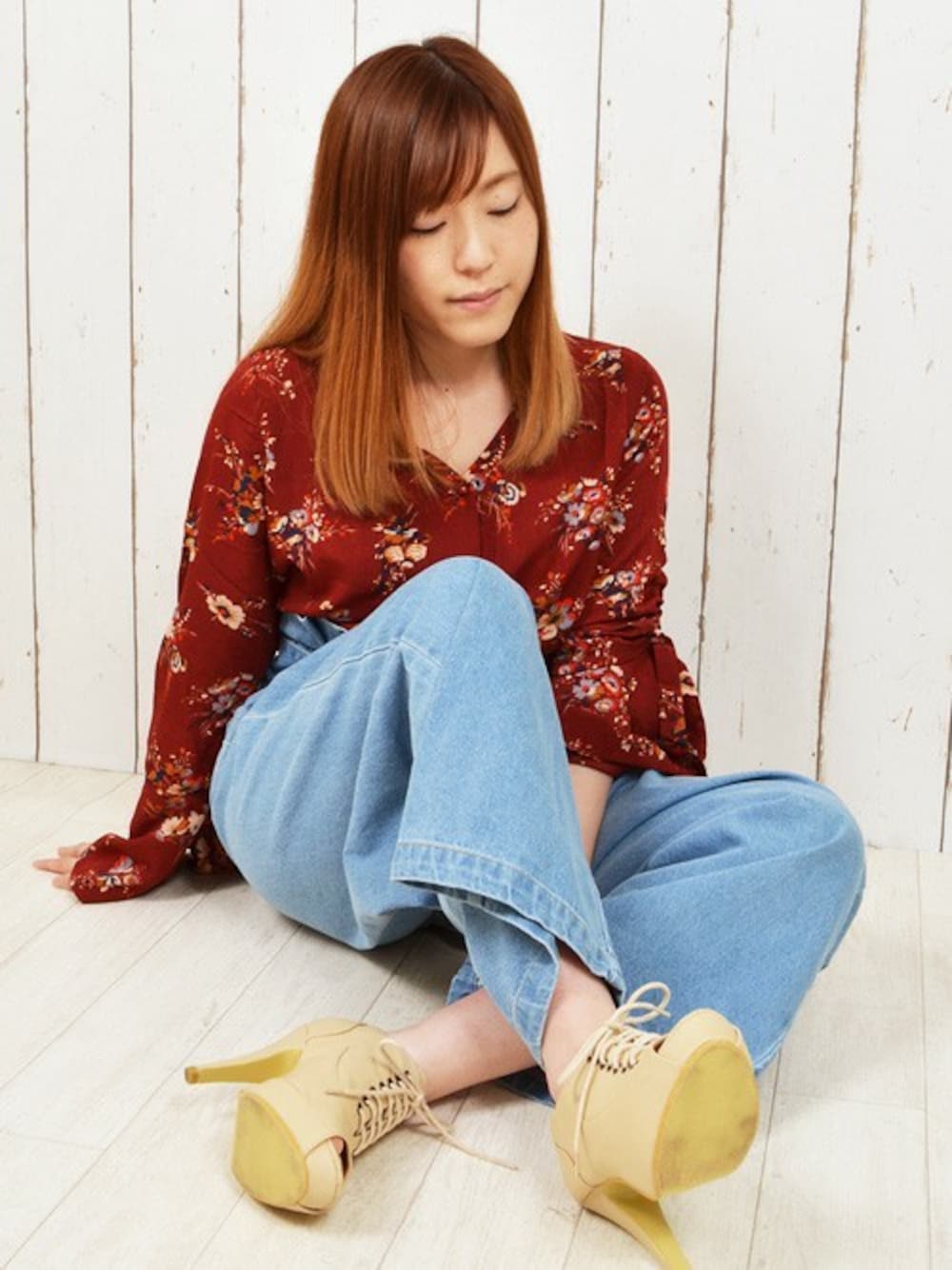 TOPS ▶ ラメ天竺メロープルオーバー \2,149 BOTTOMS▶ ベルト付きワイドパンツ ¥3,229 SHOES▶ オープントゥレースアップブーティー \2,138
