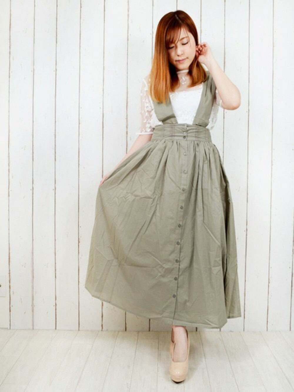 TOPS ▶ チュール花柄単色刺繍ブラウス \2,473 BOTTOMS▶ レーステープギャザースカート ¥2,797 SHOES▶ プラットフォームエナメルパンプス \3,769 カーキ×ピンクのナチュラルガーリーに✨