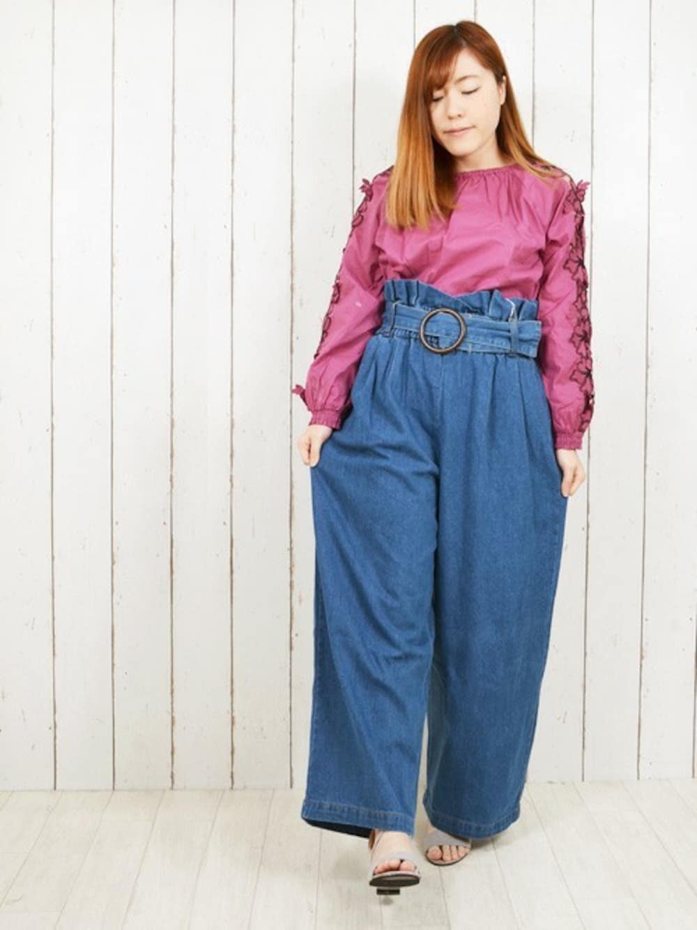 TOPS ▶ モチーフレース切替ブラウス \2,797 BOTTOMS▶ デニムハイウエストベルト付きワイドパンツ \3,229 SHOES▶アンクルベルトサンダル \2,797