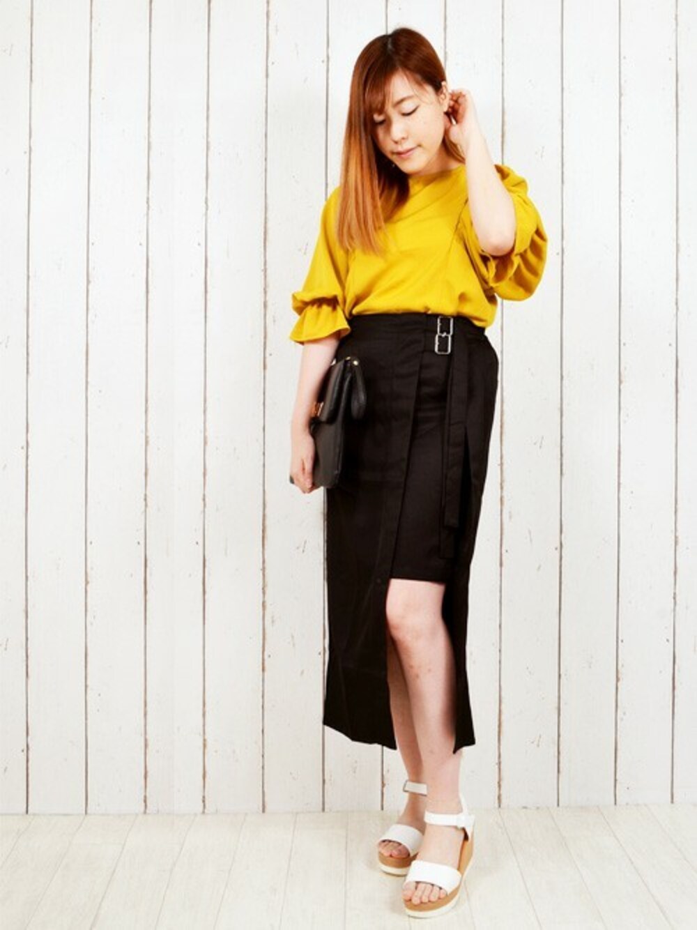 TOPS ▶ ジョーゼットギャザースリーブブラウス \2,473 BOTTOMS▶ シルケットツイルラップレイヤード風スカート \3,229 SHOES▶厚底ウェッジソールサンダル \2,689 イエロー×ブラックのお気に入りカラーコーデです♪ ジョーゼット生地のドレープ感がエレガントなブラウス💘 スリット風スカートは着やせ効果も!