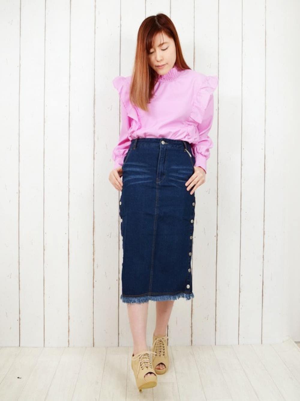 TOPS ▶ ストライプフリルブラウス \2,797 BOTOMMS ▶ デニムサイドスリットタイトスカート \3,229 SHOES▶オープントゥレースアップブーティー \2,138 ブライトカラーとフリルがめちゃくちゃ可愛いブラウスです✨ このデニムスカートはスリムだけど締め付け感がなくてラクチン! おすすめアイテムです(^^)