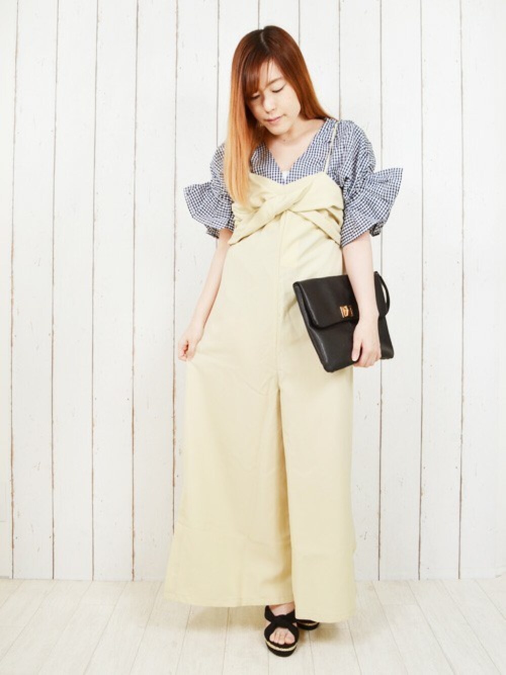 TOPS ▶ ギンガムチェックスキッパ―ブラウス \2,473 BOTOMMS ▶ スリットオールインワン \3,769 SHOES ▶ リボンウエッジソールサンダル \2,700 ブラック×ベージュのガーリーコーデ💘 ギンガムチェックとフリルがガーリーなスキッパーシャツがポイント!