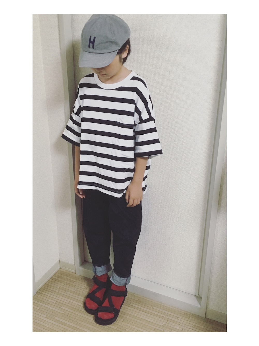 息子コーデ。 トップスはダボッとさせたかったのでレディースもので。
