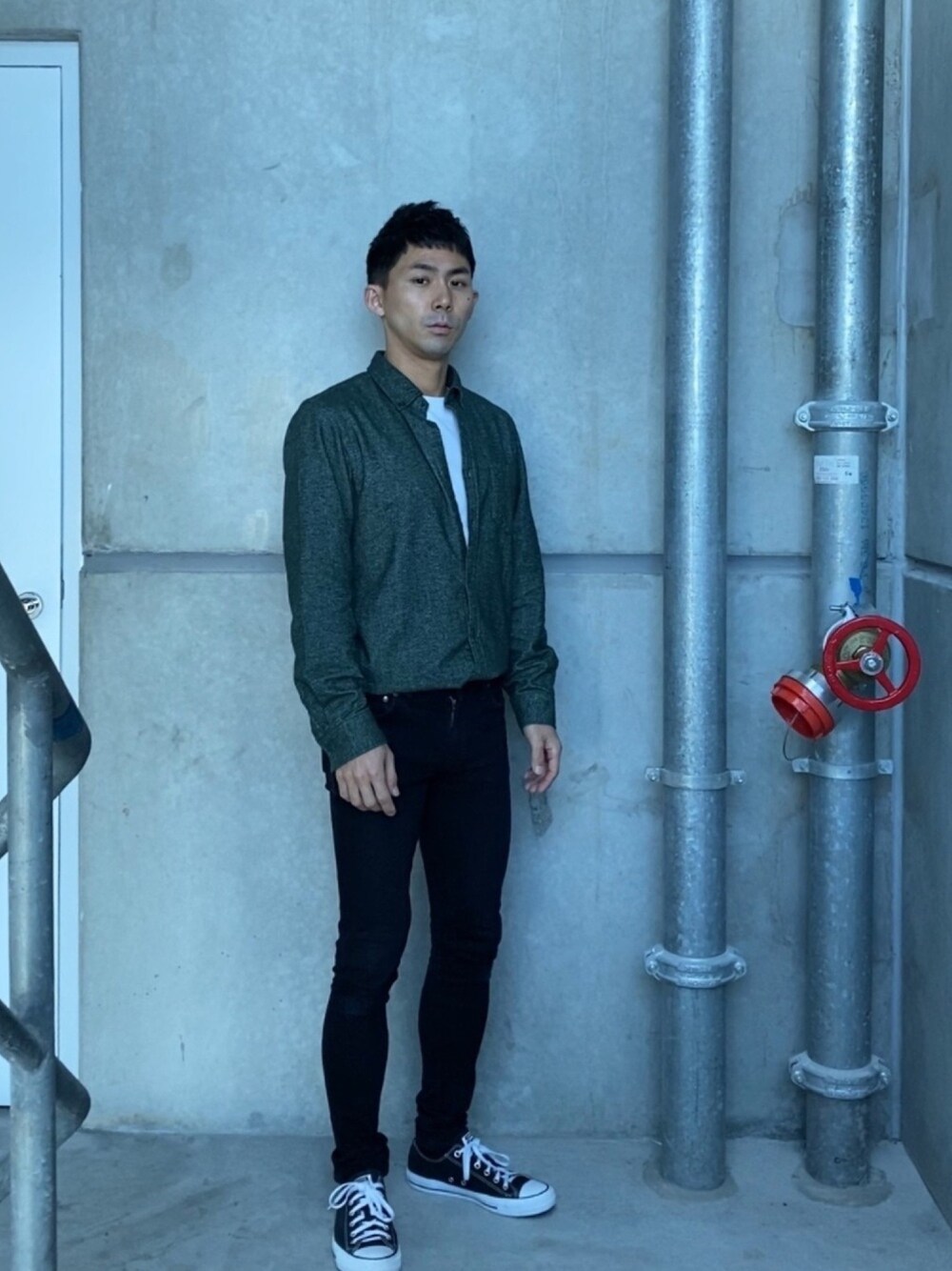 大きめシャツをスキニーにイン! 緑は黒以外には合わせにくいですね😅