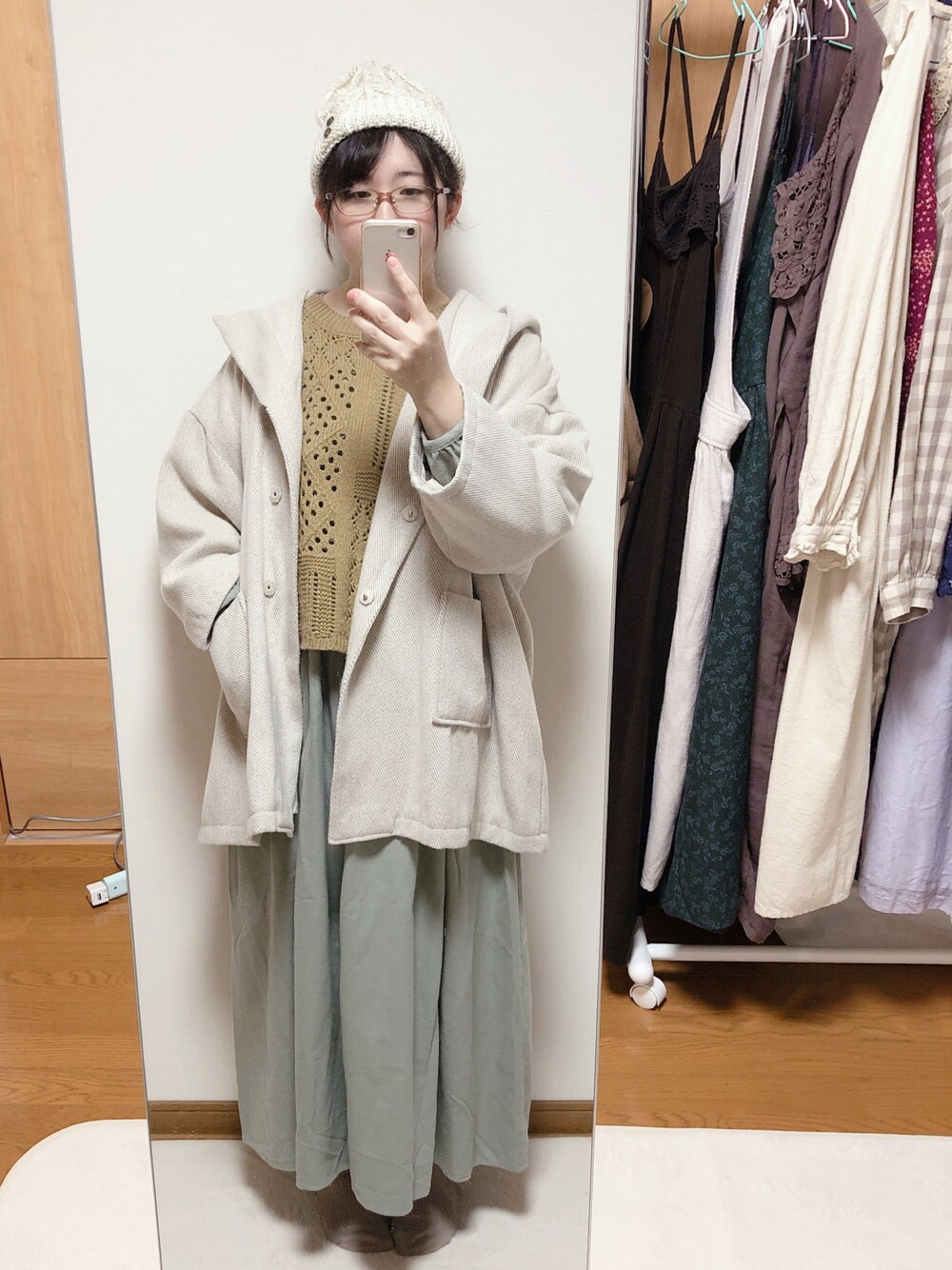 しまむらのボタン付きニット帽にゆるっと羽織れるフードコート、ワンピースにニットベストの冬コーデ⛄️