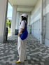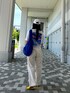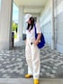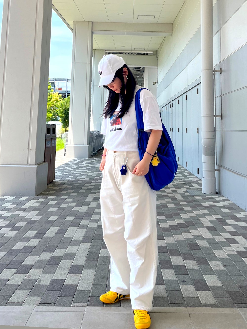 全身白に、差し色を青と黄色。青と黄色は合うと思う。 ユニクロのUTでバックプリントが可愛いETのを。