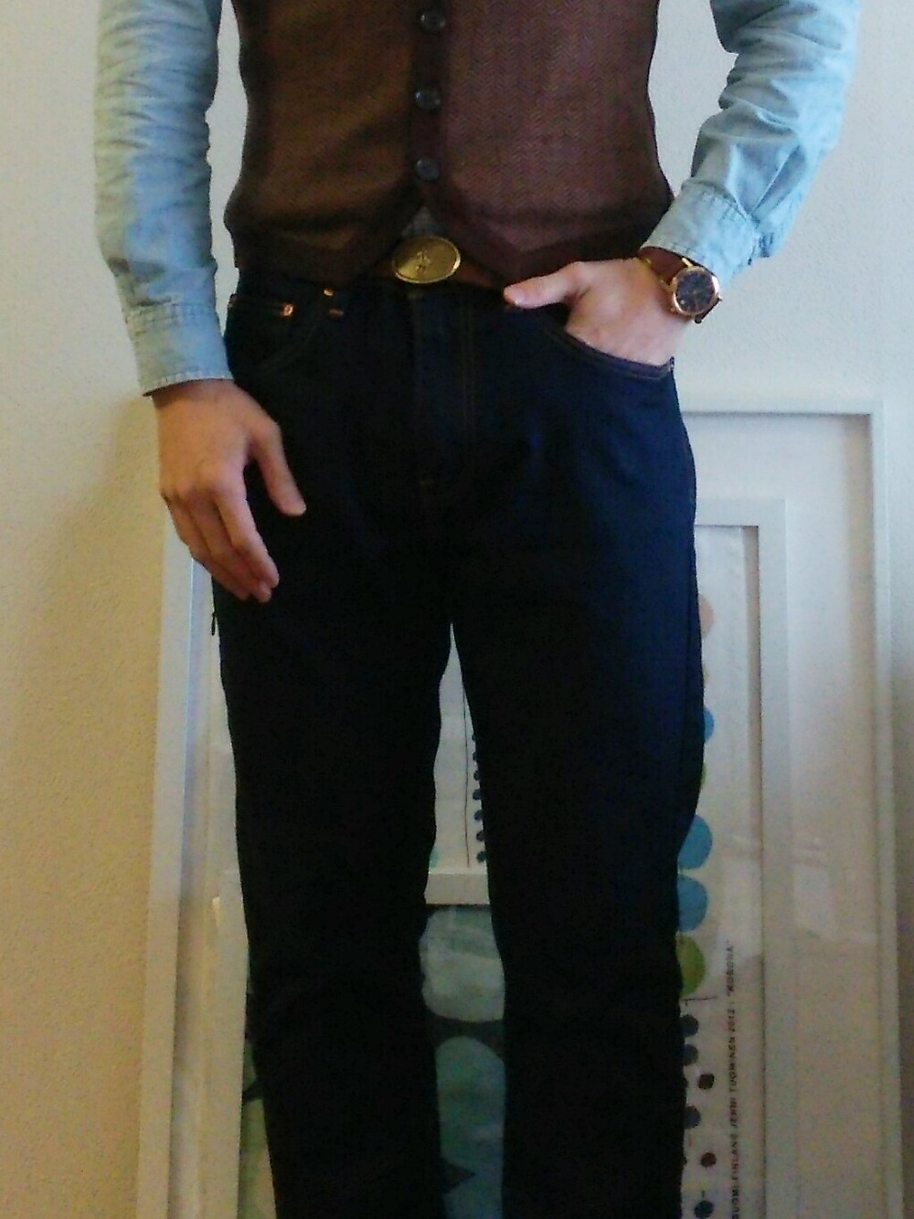 シャンブレーシャツにデニム、ベストをタイトにあわせウエスタンかつ都会的なコーディネートに。時計とベルトはゴールドで統一。
