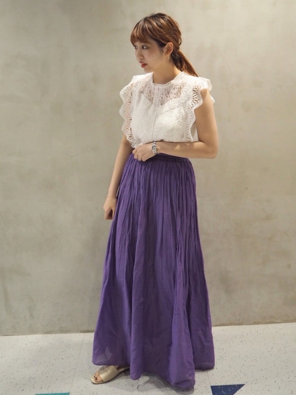 ご覧頂きありがとうございます🗣♡ 紫のスカートお気に入りです🍇 かなりロングなので、綺麗めのトップスと合わせると、かなり大人っぽく着こなせます( ᵕᴗᵕ ) トップスも二の腕が隠れるので安心して着ることができますよ( ¨̮ )/
