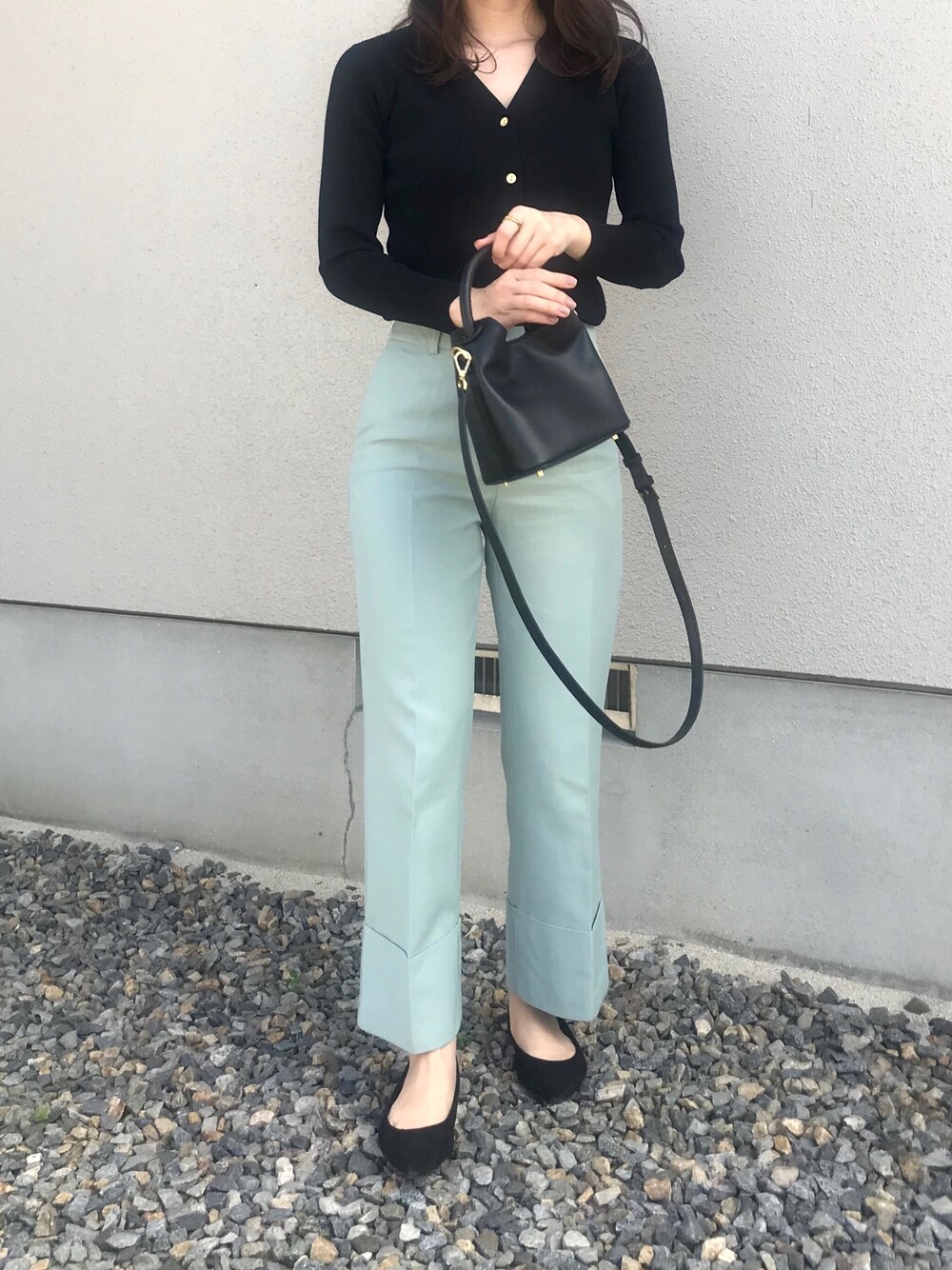 ミントグリーンのパンツを主役に、その他のアイテムは黒で統一しました❤︎
