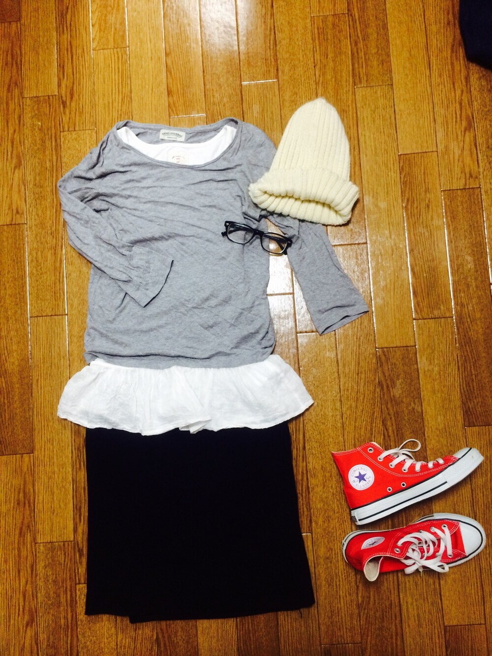 ニット帽:古着屋 トップス:ナノユニバース ペプラムトップス:雑貨屋 スニーカー:コンバース