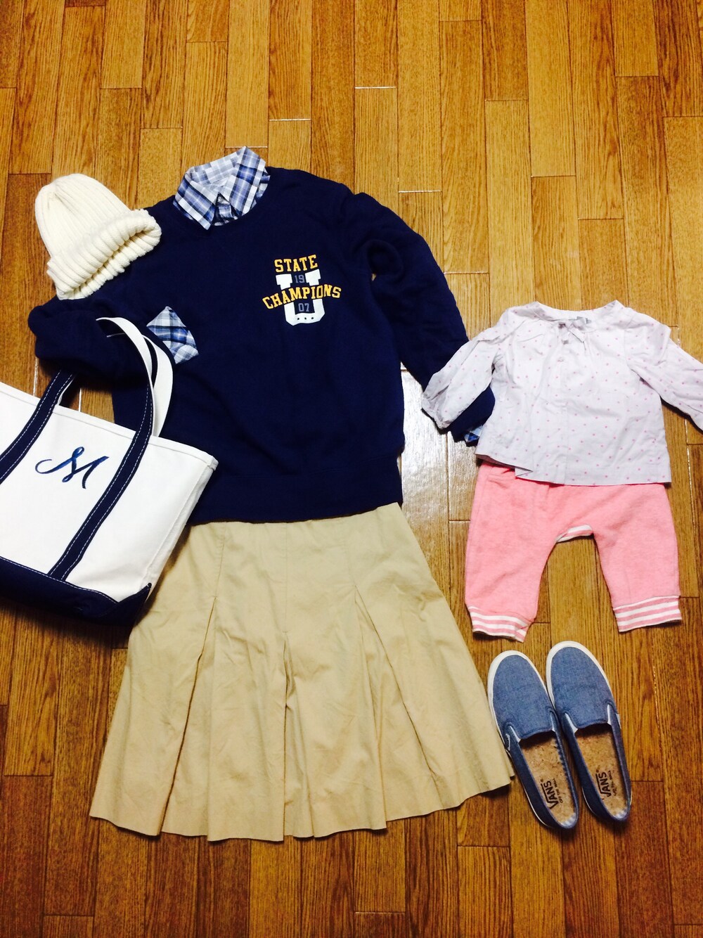 キャップ:古着屋 シャツ:古着屋 スウェット:UNIQLO スカート:PaulSmith スリッポン:VANS トートバッグ:L.L.Bean ブラウス:BABY GAP
