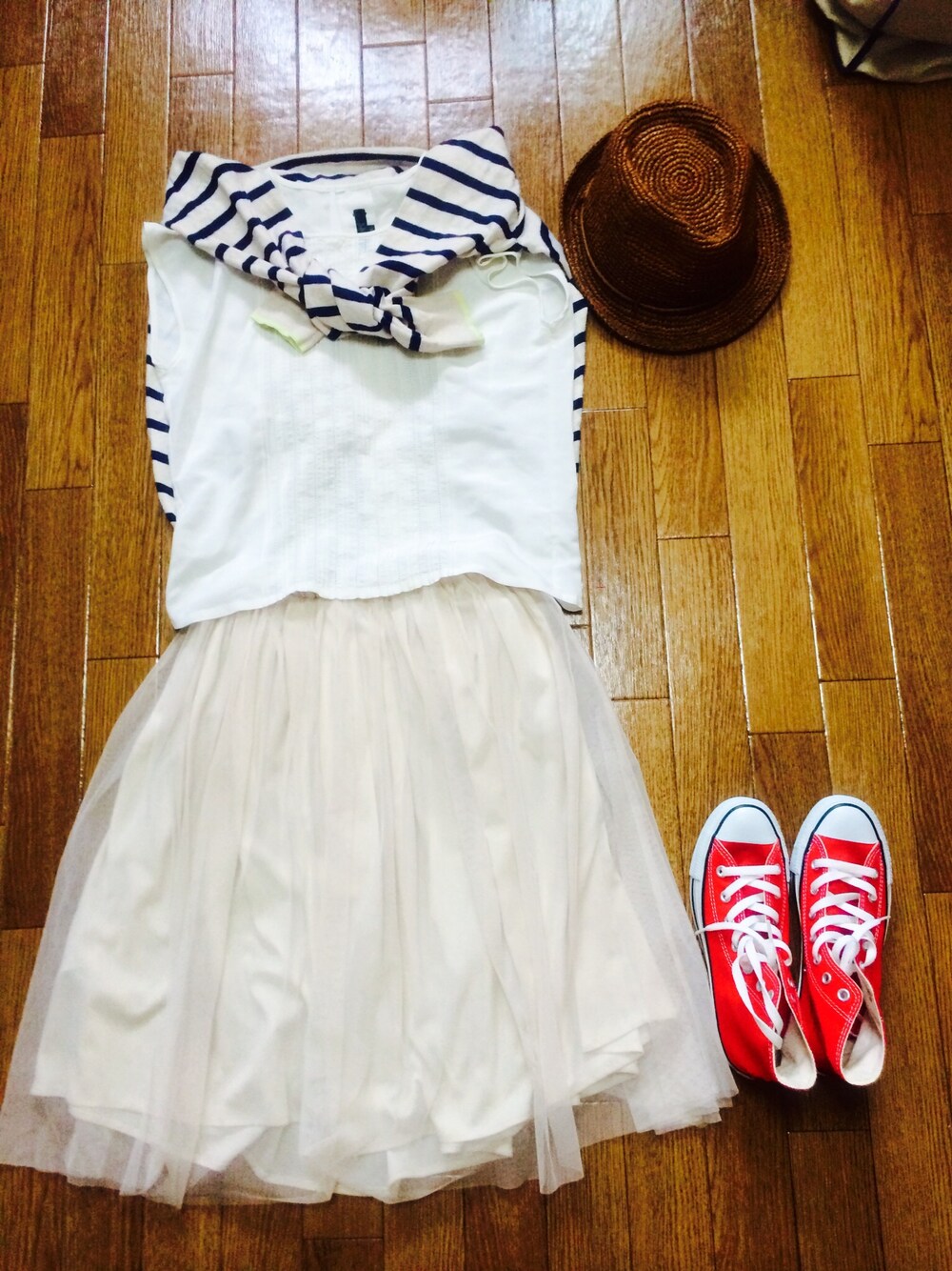 麦わら帽子:ブランド不明 カーディガン:GU トップス:古着 シフォンスカート:earth music&ecology スニーカー:CONVERSE