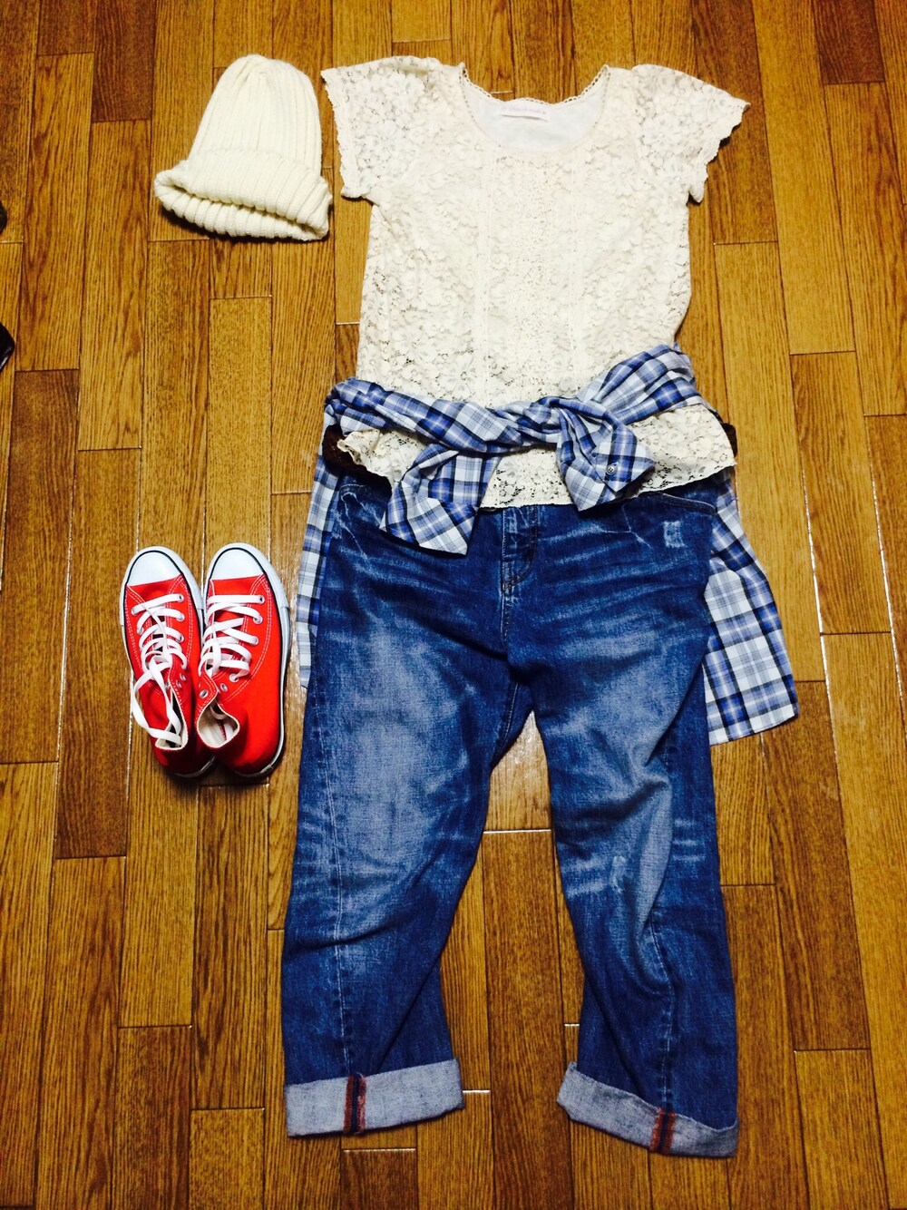 ニット帽:古着屋 レーストップス:31 Sons de mode シャツ:WEGO デニム:LOWRYS FARM スニーカー:CONVERSE