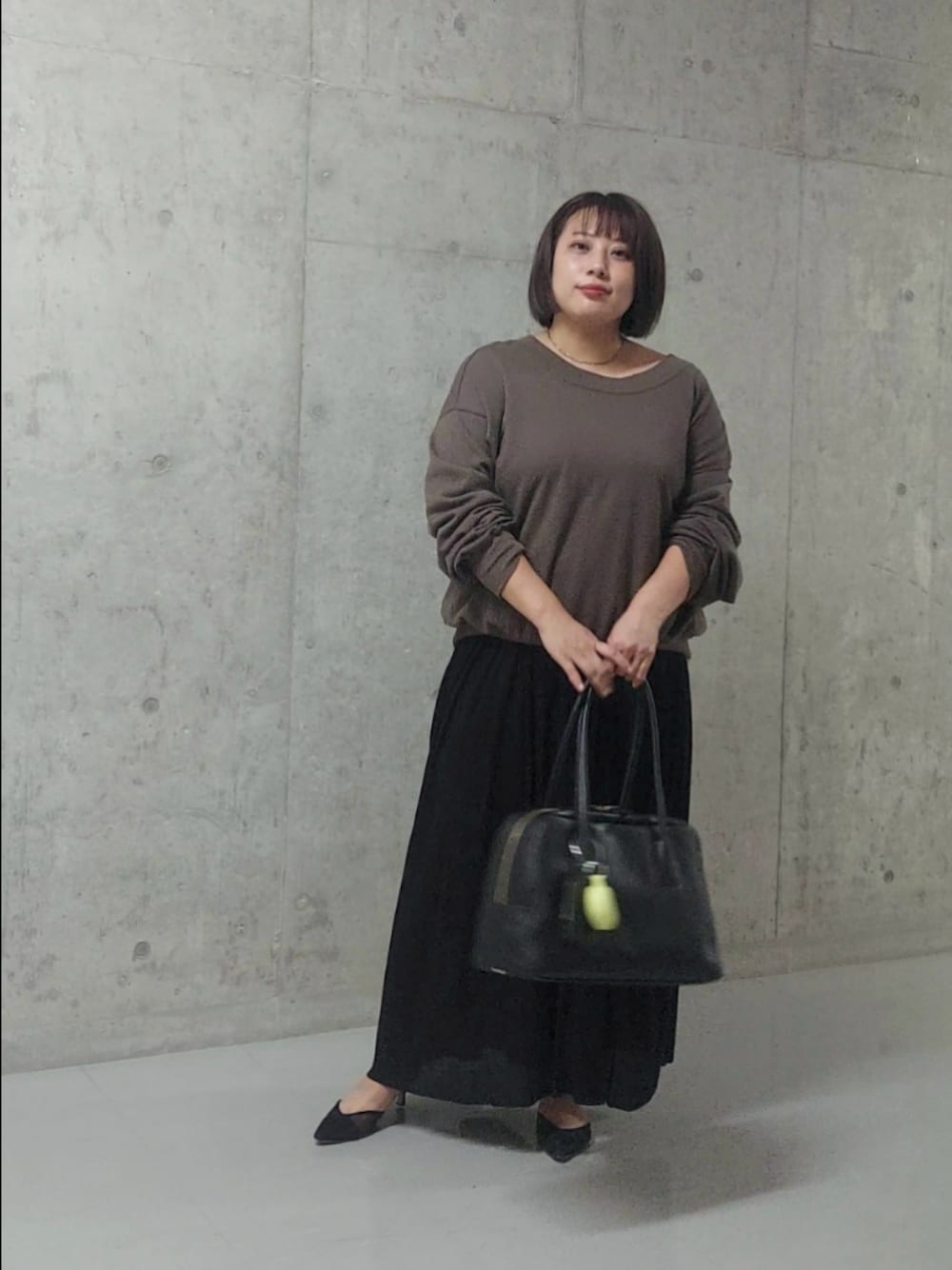 生地はさらりとしていますが 秋を意識したカラーでコーディネートを組みました。 2wayスウェットは 首もとがキレイにあくので、骨ストさんも バランス良く着ていただけます。