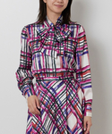 身長 : 156 cm 骨格タイプ : ウェーブ ブラウス:0(7号)Sサイズ ジャケット:1(9号)Mサイズ 華やかなピンクのチェックにブラウンカラーのジャケットを合わせて、秋らしく上品なカラーコーディネートに。 ブラウスは肌触りの良いサテン素材で透け感は気になりません。サイドでウエストシェイプされているので程よく余裕もありつつ、すっきりとしたシルエットになっています。