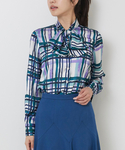 身長 : 160 cm 骨格タイプ : ウェーブ ブラウス:0(7号)Sサイズ ジャケット:0(7号)Sサイズ スカート:1(9号)Mサイズ 鮮やかなチェック柄にボリュームのあるボウタイが着映えするブラウスに、ノーカラージャケットを合わせたオフィススタイル。