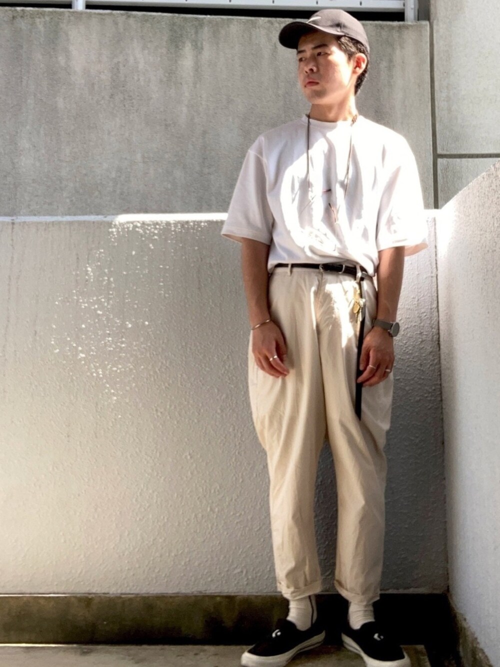 白と黒 TシャツはUNIQLO U グラスコードはエンダースキーマ