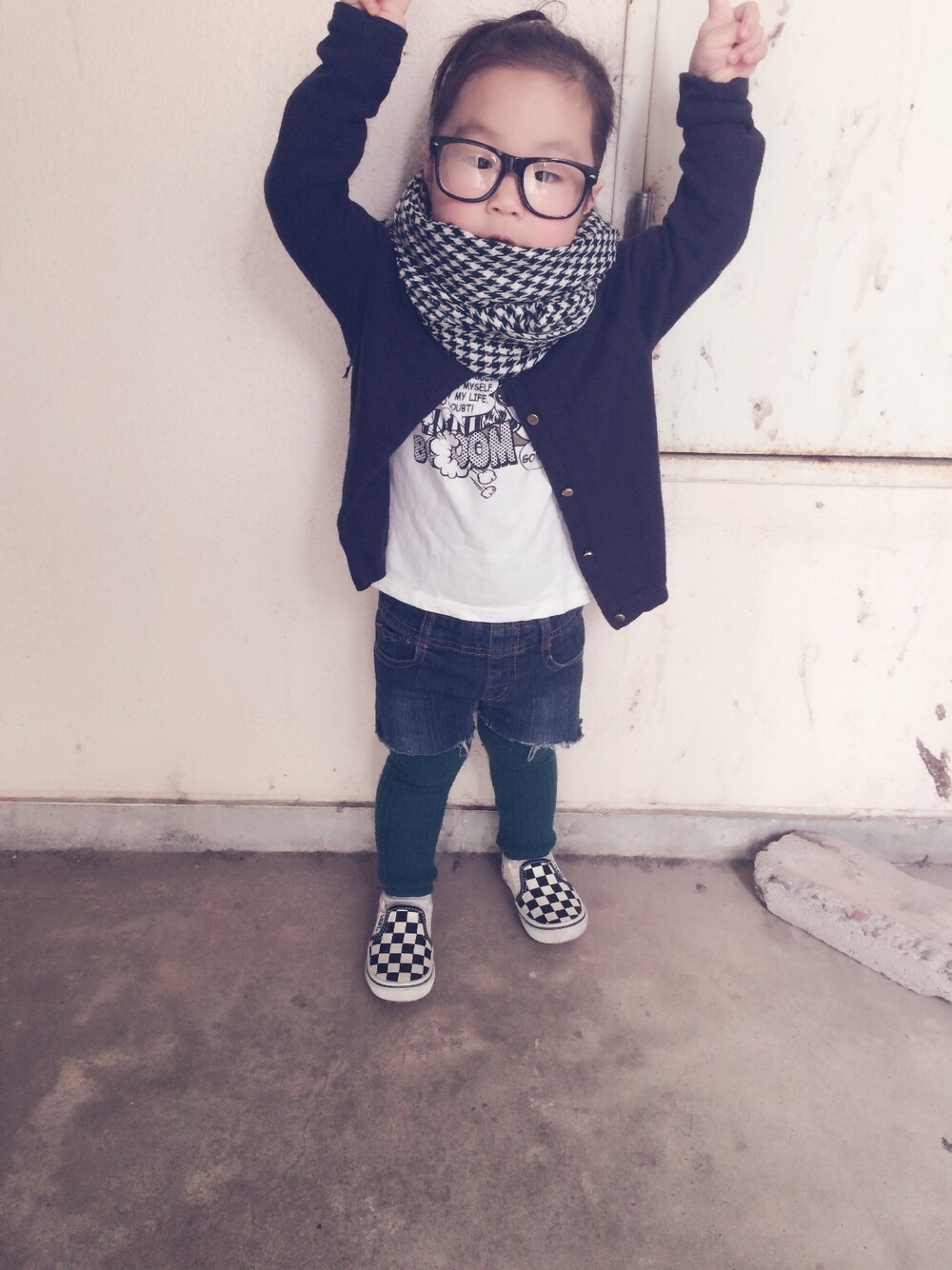 マフラーはパパから借りました(笑) カーディガン H&M Tシャツ Avan Lily パンツ リメイク タイツ しまむら シューズ Vans