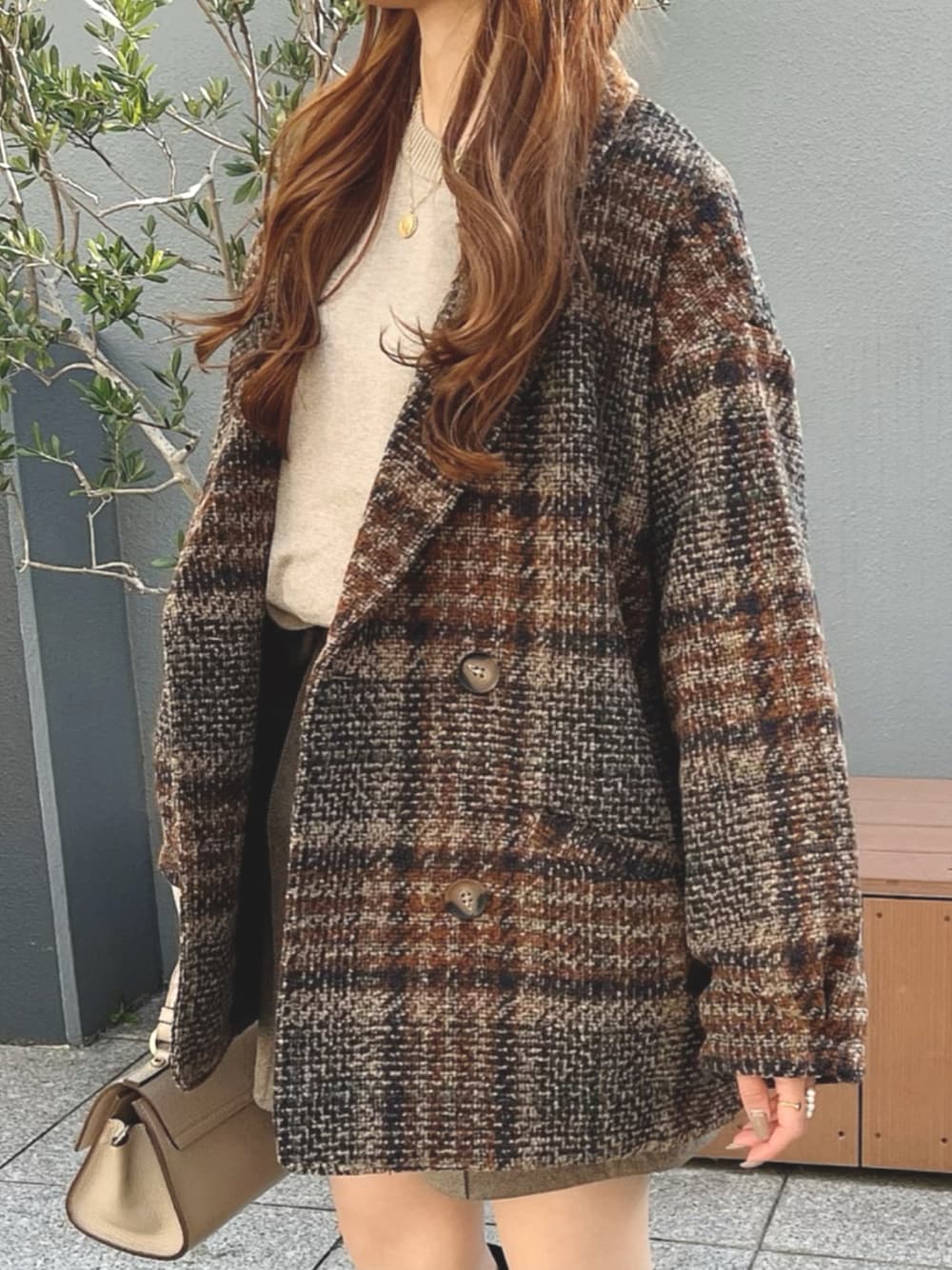 kataoka__mikaのテーラードジャケット「レトロな主役級アイテム。ブークレー起毛チェック柄 オーバーサイズ ダブルジャケットコート」を使ったコーディネート