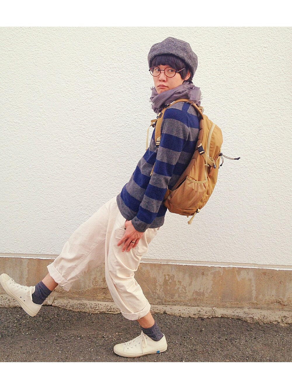 . ベレー:VOO ストール:niko and... ニット:BEAMS パンツ:niko and... 靴:SHOES LIKE POTTERY 鞄:THE NORTH FACE .