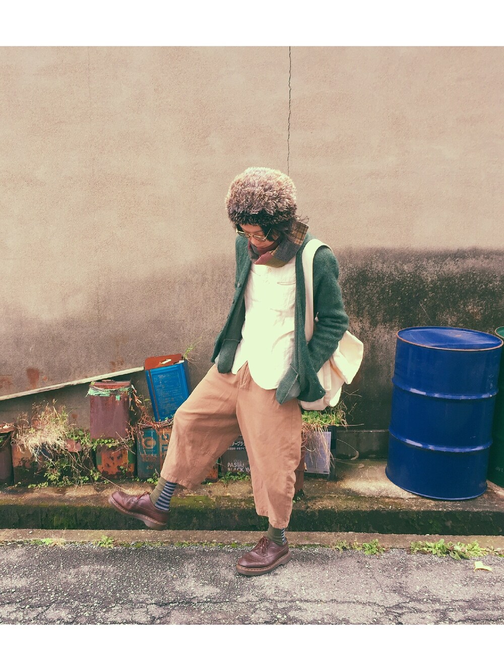 . 帽子:カオリノモリ カーデ:vintage シャツ:mean パンツ:niko and… 靴:DrMartens 鞄:handmade .