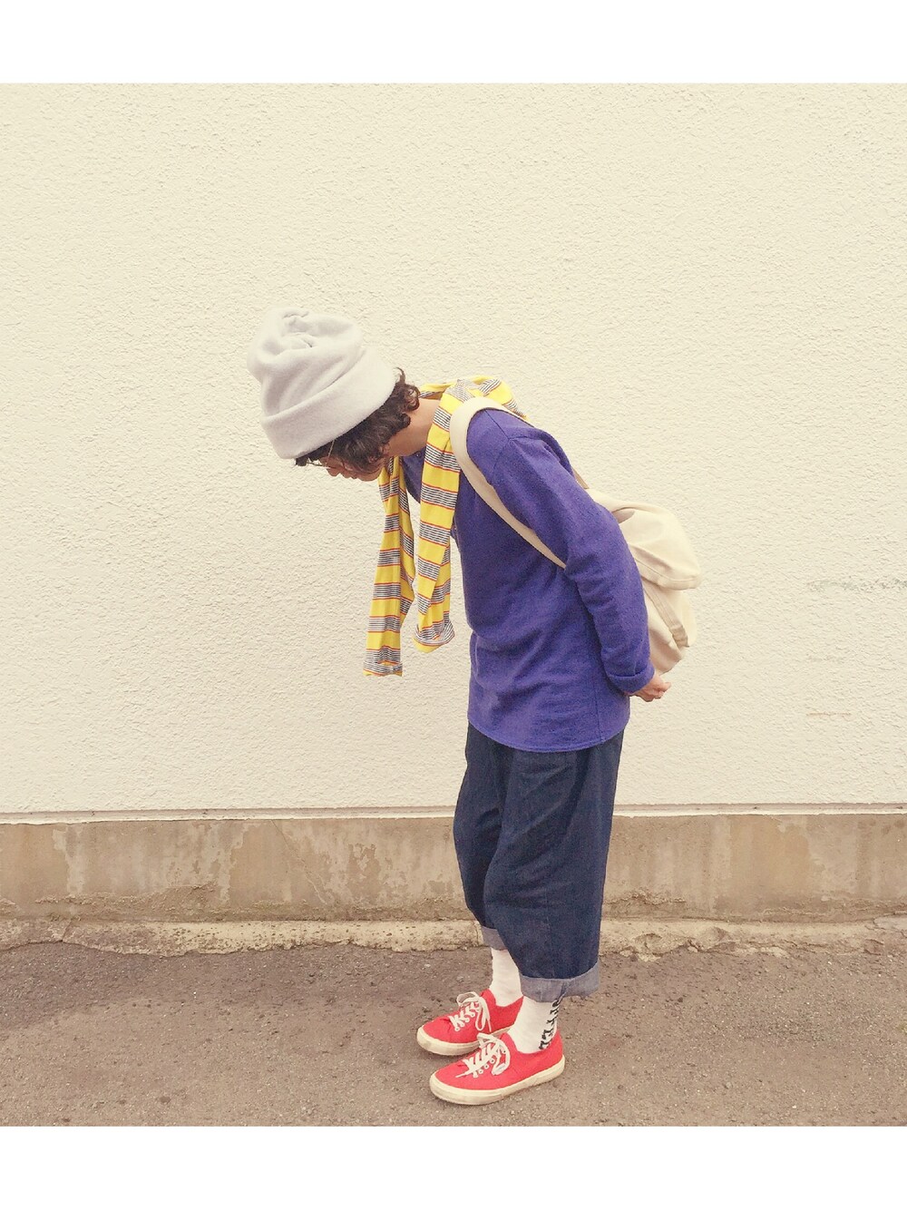 . 軽装始め。 帽子:hand made ニット:KAPITAL ロンT:MR.GENTLEMAN パンツ:niko and … 靴:SUPERGA 鞄:hand made .