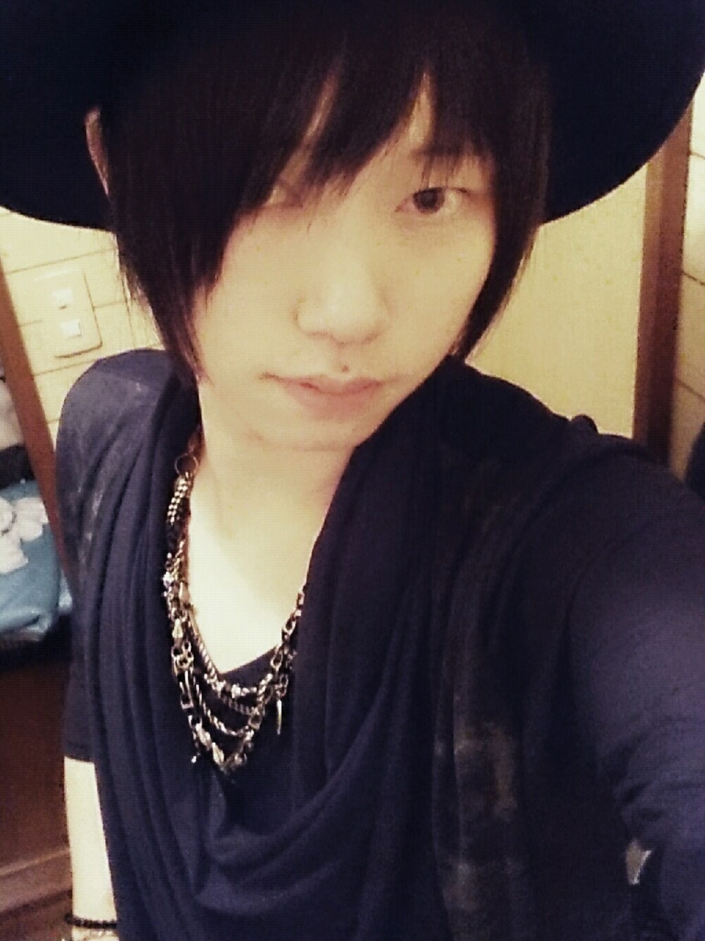 全身黒!ストールカットソーを主体に細身の黒スキニーで締めてます。(写らんかった)今日買ったノーブランドのつば広ハットはなかなかいい感じ!