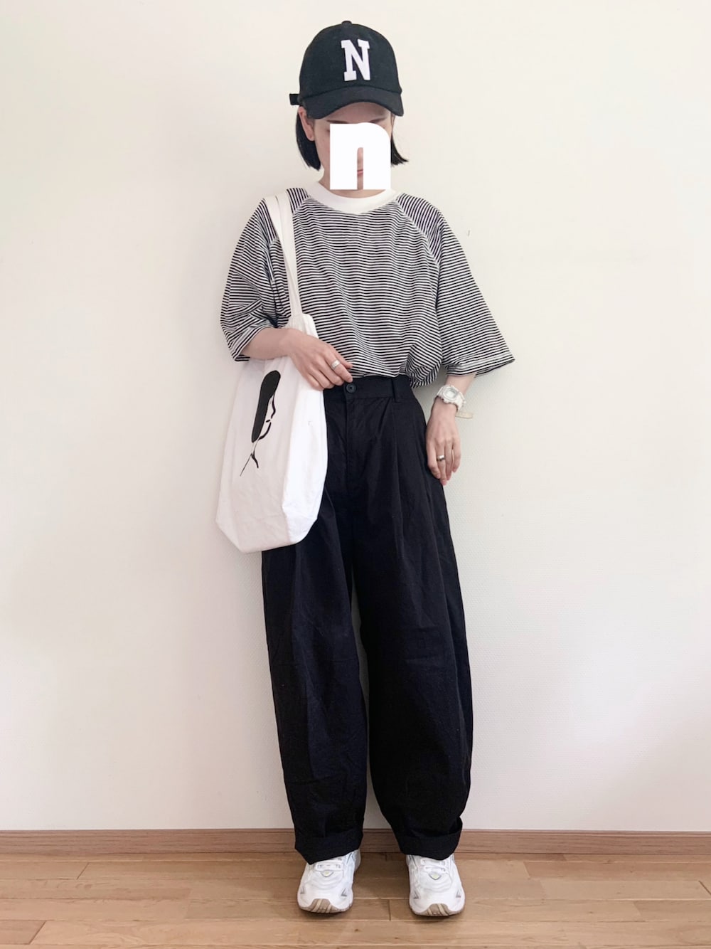 🩹🖤💭🎵🤍📞 珍しく白黒コーデ⸜( •⌄• )⸝ 半袖なったり長袖なったり 気温が安定しませんな(・-・`)