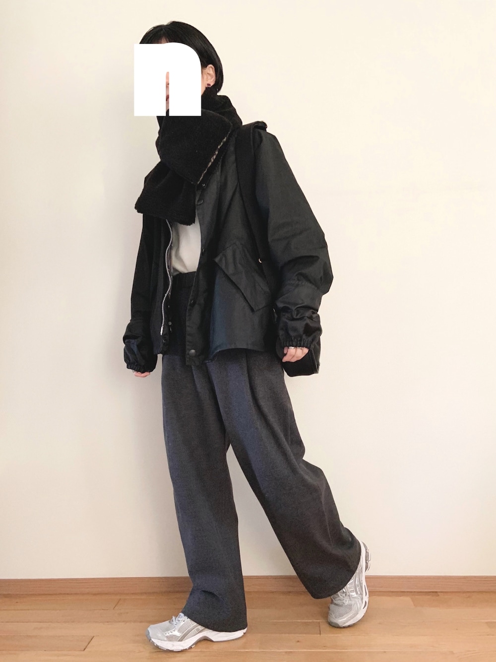 上からグラデ 濃(黒)→薄(グレー) 2枚目のパンプススタイルと迷ったけど 歩き回る予定あったのでスニーカーで( ´ω` ) 体温のマフラーぬくい😊🧣🔥!