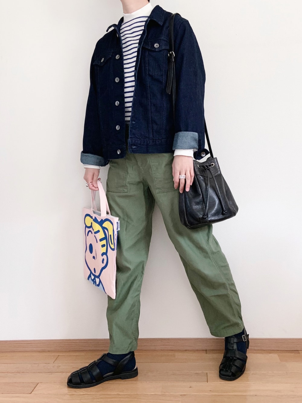 グルカサンダルに靴下⊂( ・ω・ )⊃ 真っ黒だと重くなりすぎるかなと思い、 ネイビーにしてみた∩(`・ω・´)⊃バッ🫐◝✩ サブバッグで春感🌸