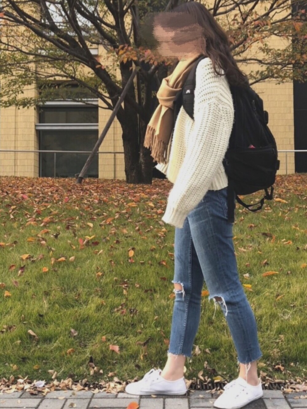 インナー短すぎて実はお腹のヒートテックチラ見えコーディネートです🍁 膝空きジーンズはお気に入りすぎて買った時よりだいぶ膝空きです!さらに裾を裁ちばさみで切ることでダメージを与えた記憶があります^_^