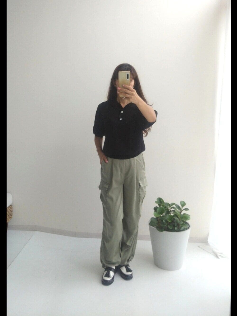 naru(nissen本店)のカーゴパンツ「サテンパラシュートパンツ」を使ったコーディネート