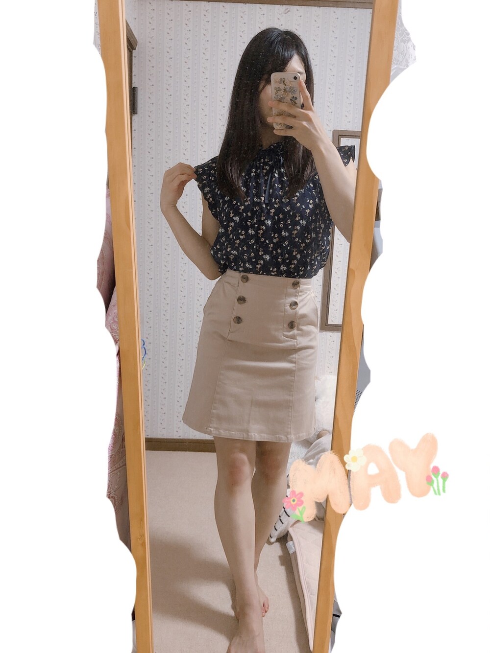 ベージュのタイトスカートに花柄のブラウスがお気に入り🌸 今は自粛中やけど、緊急事態宣言解除されたらこれ着てデートしたいなぁ🥰