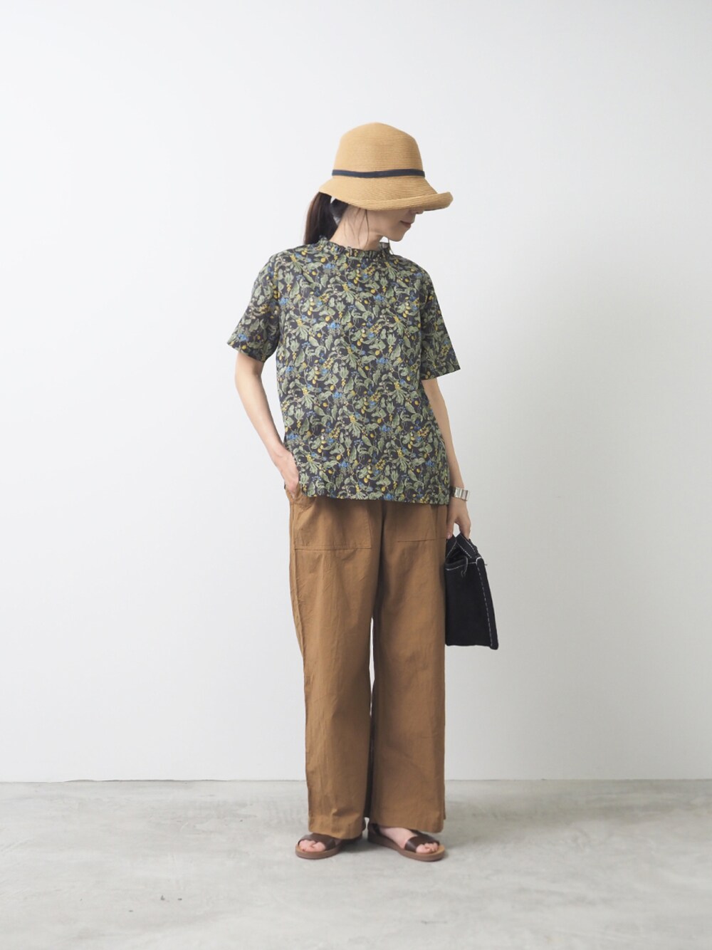 ブラック系のシャツ/ブラウス、グレー系のパンツを着用したレディースの夏コーディネートの2枚目の写真