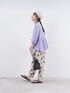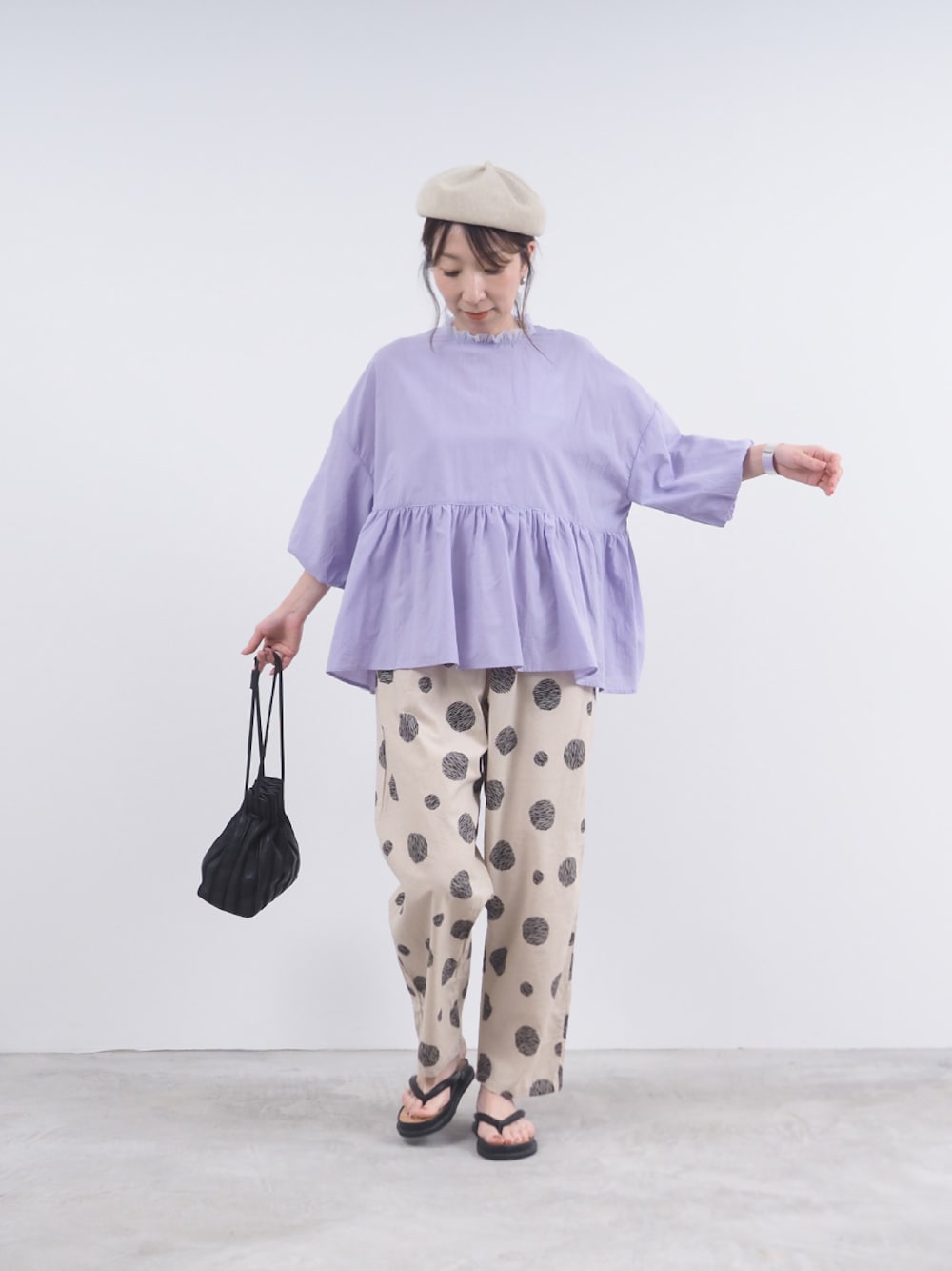 パープル系のシャツ/ブラウス、ベージュ系のパンツを着用したレディースの夏コーディネートの2枚目の写真