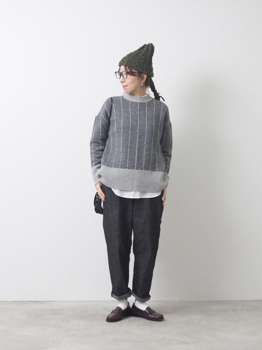 グレー系のニット/セーター、ブラック系のデニムパンツを着用したレディースの秋コーディネートの2枚目の写真