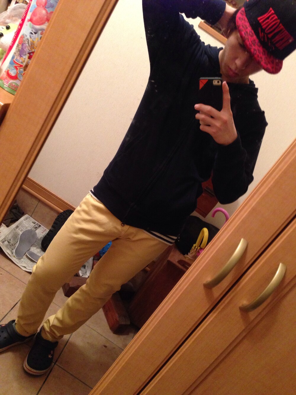 レッド系のキャップを着用したメンズの春コーディネートの1枚目の写真