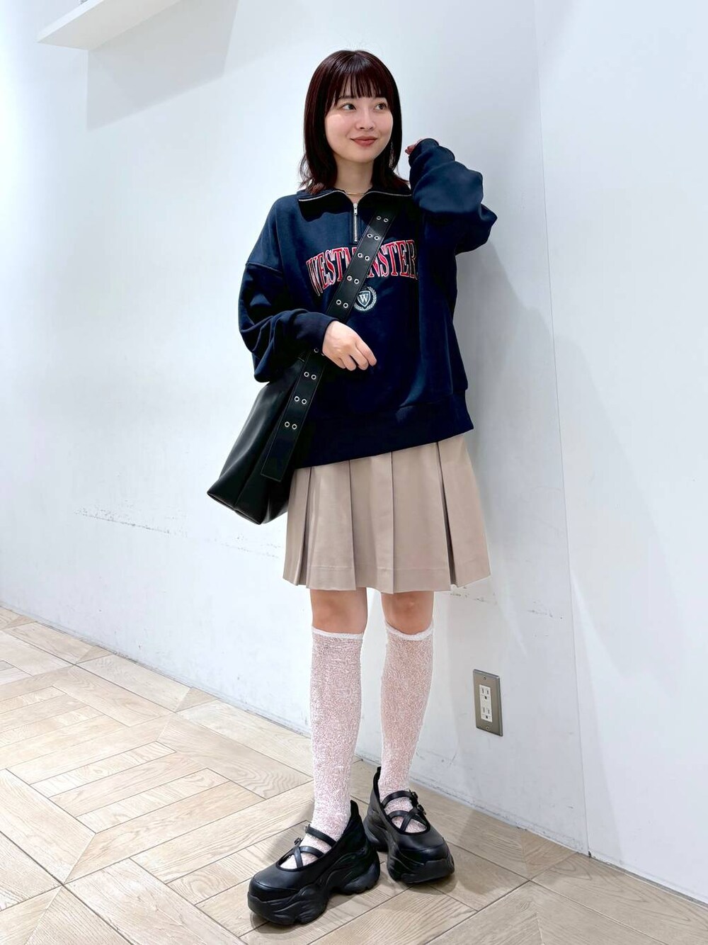 ✳︎スクールガーリーコーデ✳︎ カジュアルなスウェットトップスを、 ミニスカートと今年トレンドのレース靴下を合わせでスクールガーリーコーデに着こなしました♡ ハーフZIPのスウェットは丈感が短すぎず、長すぎないのでワイドパンツやフレアスカートなどもバランスよく着こなせるアイテムです! スカートは中のペチコートがパンツになっているので、 安心な履き心地ですよ🍃