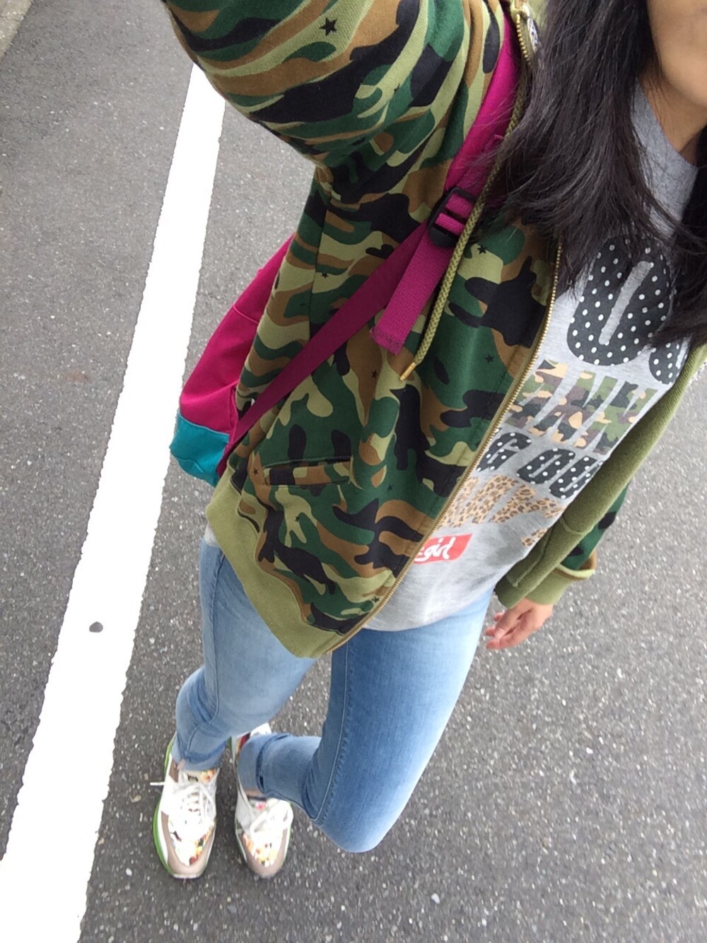 パーカー:Xgirl Tシャツ:Xgirl デニム:ZARA スニーカー:DATE バックパック:adidas ストリートカジュアル👟💚💛💙
