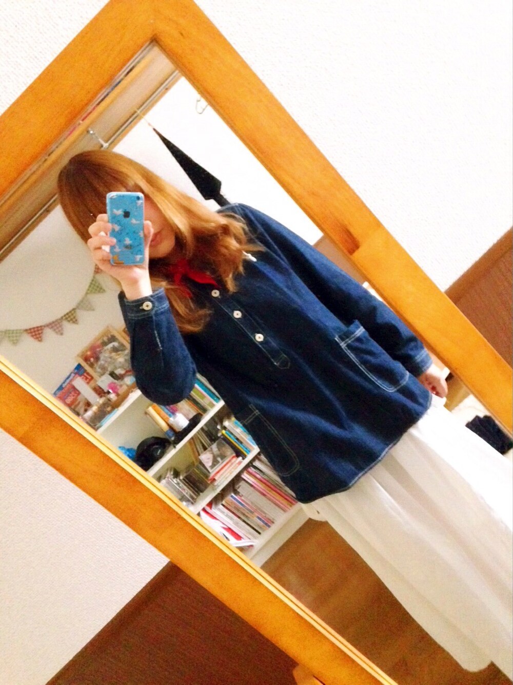 白ロングスカート+古着のデニムシャツ ポイントのバンダナをプラス○*