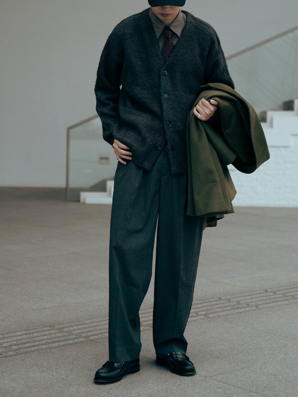 風早ゆうたのカーディガン/ボレロ「メランジ モヘアライク シャギーVネックニット カーディガン」を使ったコーディネート