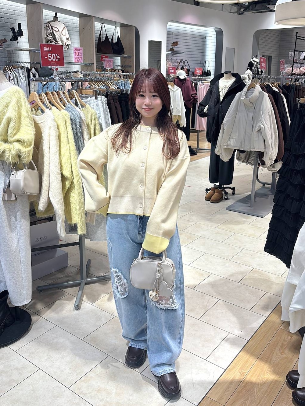 ⭐各アイテムのおすすめポイント  ̄ ̄ ̄ ̄ ̄ ̄ ̄ ̄ ̄ ̄ ̄ ̄ ̄ ̄ ̄ ̄ ̄ 【トップス】 首まわりやお袖がバイカラーのハイショクになっているので、シンプルすぎずカラーを取り入れやすいカーディガンです💛 生地は分厚すぎず伸縮性があるので、インナーを着込むこともできます🙆♀️ 【ボトムス】 ダメージレースがワンポイントの春デニムです👖🌸 カジュアルなイメージが苦手な方も可愛い印象になるので、挑戦しやすくなってます✨ ワイドストレートで足幅やお尻まわりがゆとりあるのでライン拾いにくいです🙆♀️