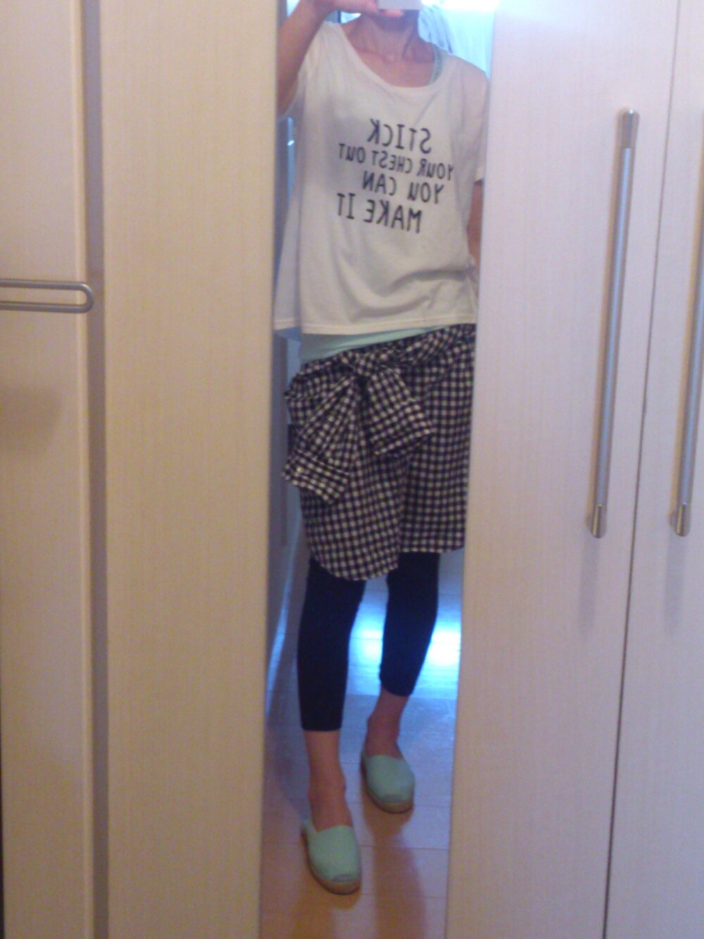 ギンガムシャツをスカートにアレンジ。 モノトーンにミントブルーを差し色。 暑い日も可愛く過ごしたい!