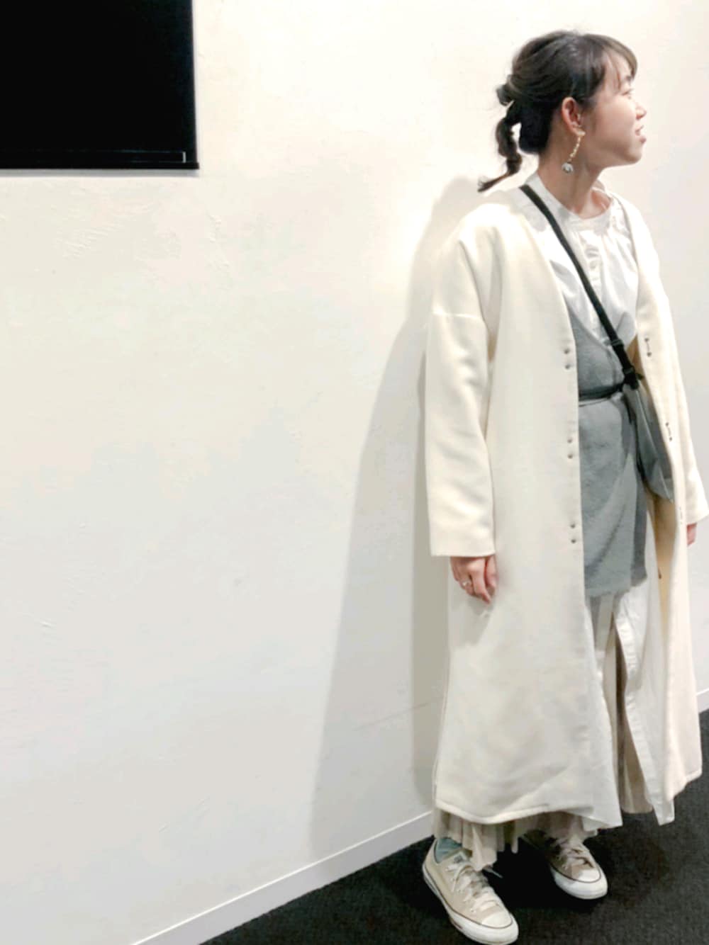 1つ前の投稿のコート有りverです。 バレバレですが、KBFがとても好きです。 オールホワイトに差し色でグレーを…! 実は靴下もグレーでした。 ホワイトのコートは横スリットが入っていて、形が綺麗でお気に入りです。