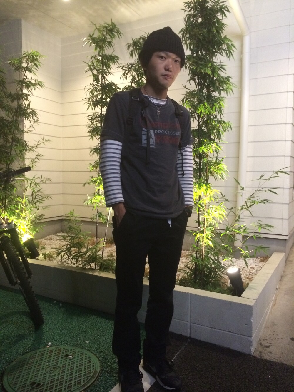 前回上に着てたオーシバルを今度はインナーに使ってみました。 ラーメン屋さんの前で友達に撮ってもらいました。 ラフな感じでベルトは靴ひもを使ってます。